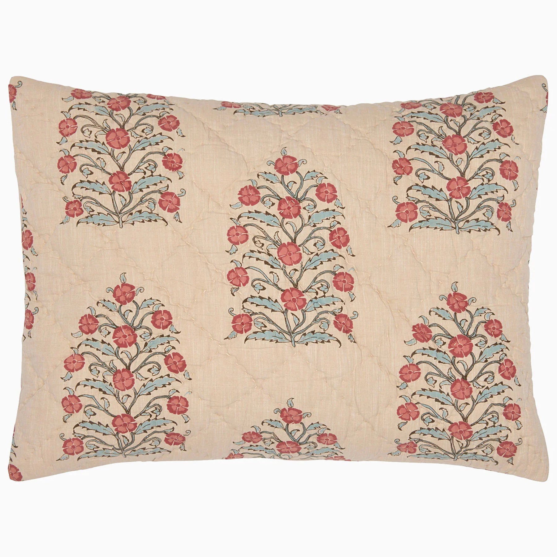 Printed with a romantic floral pattern rooted in classical block printing shapes, brought to life in soft shades of azalea and blush. Hand quilted on super soft cotton slub chambray, the same as our best selling Vivada quilts.