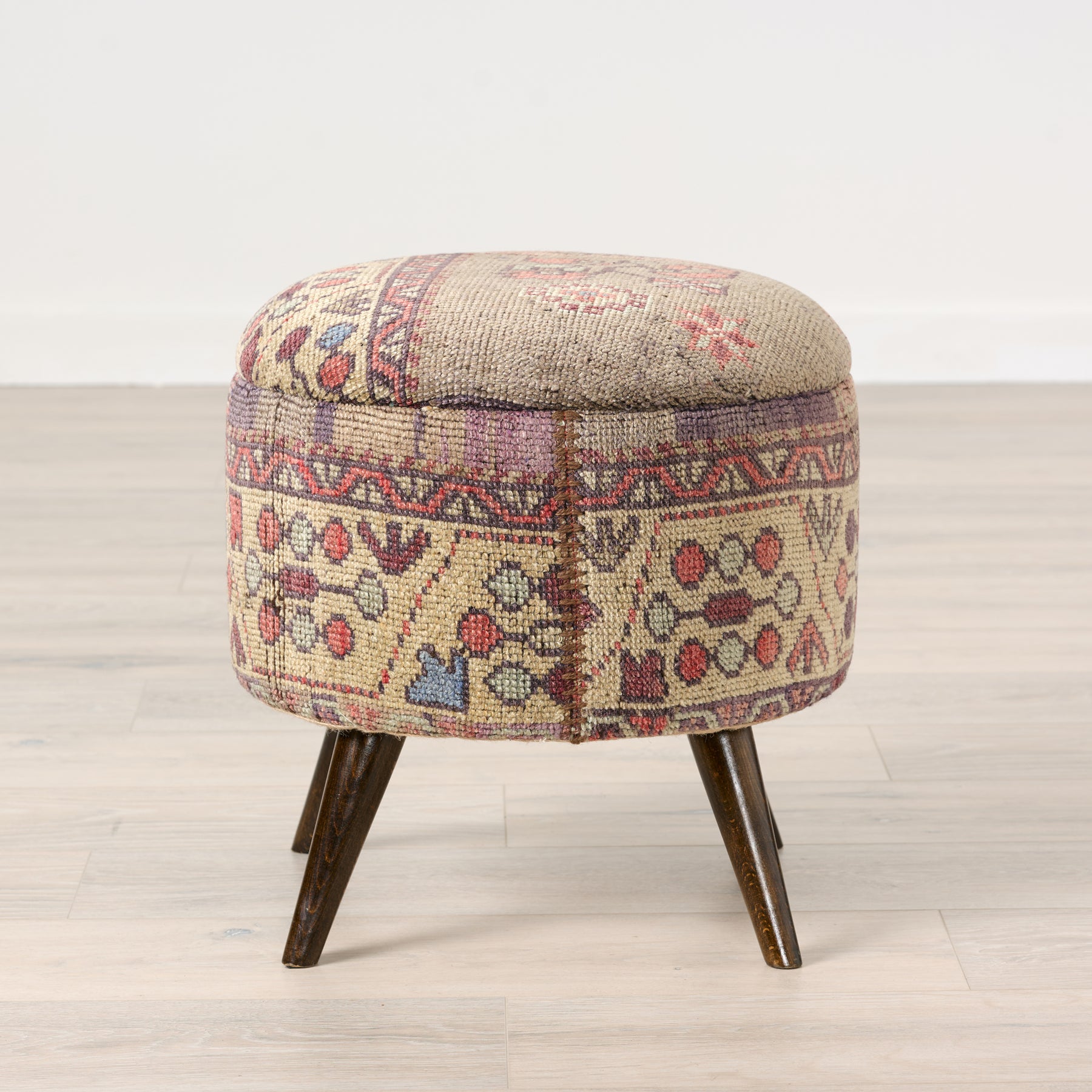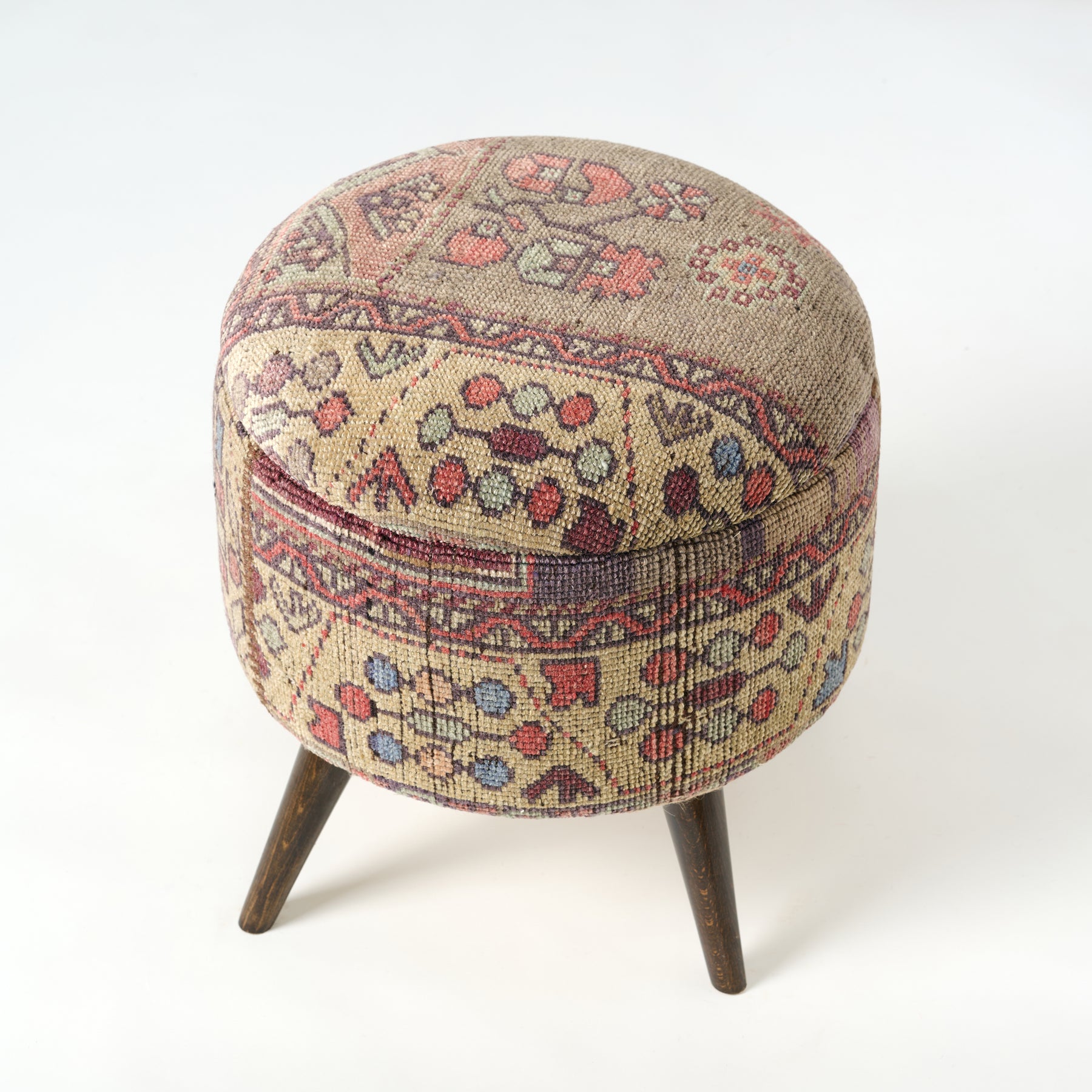 Round ottoman with patterned fabric cover on a wooden floor.Vintage Rug Small Ottoman 0725-A.