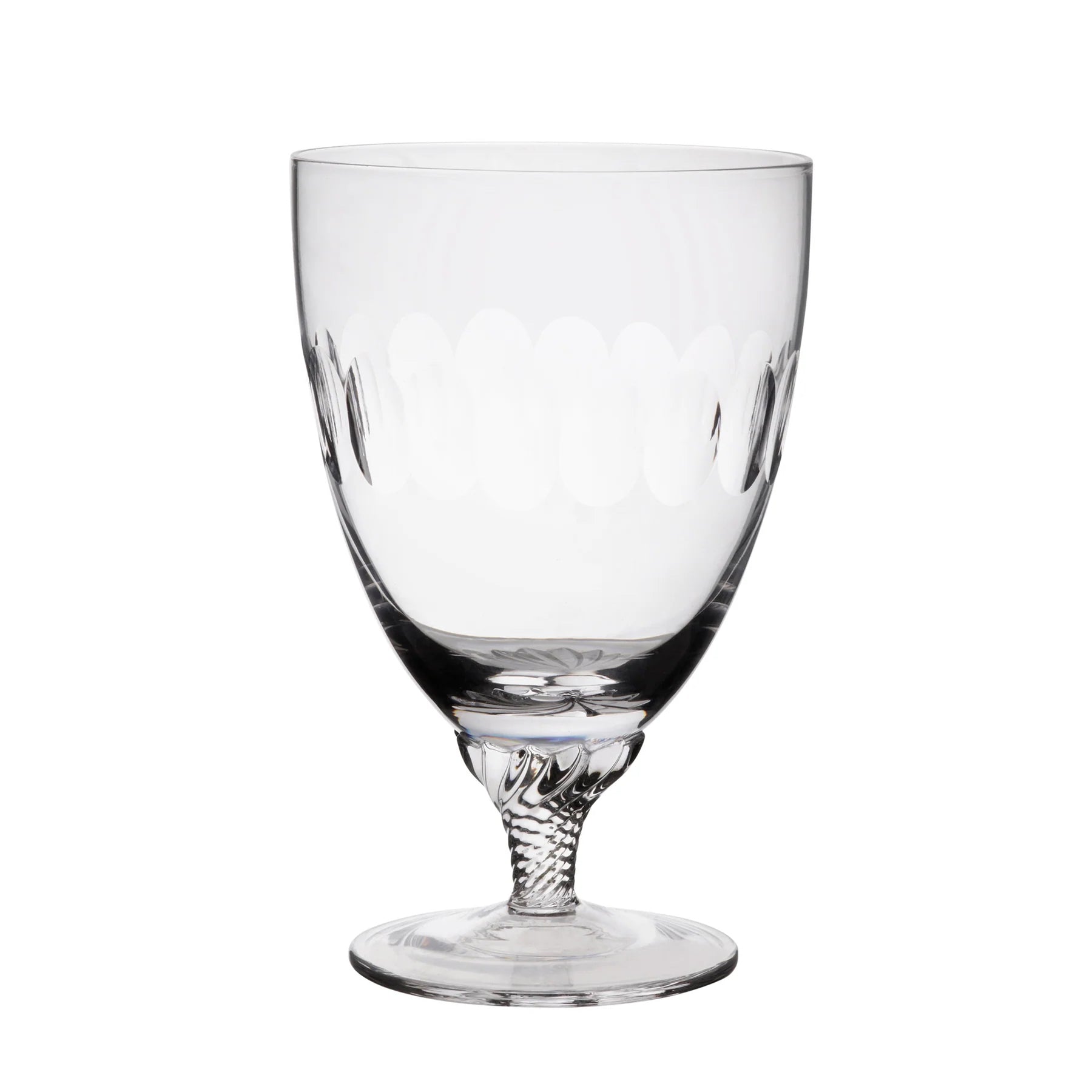 Each glass has been hand-blown and hand-engraved, with a short twisted stem.