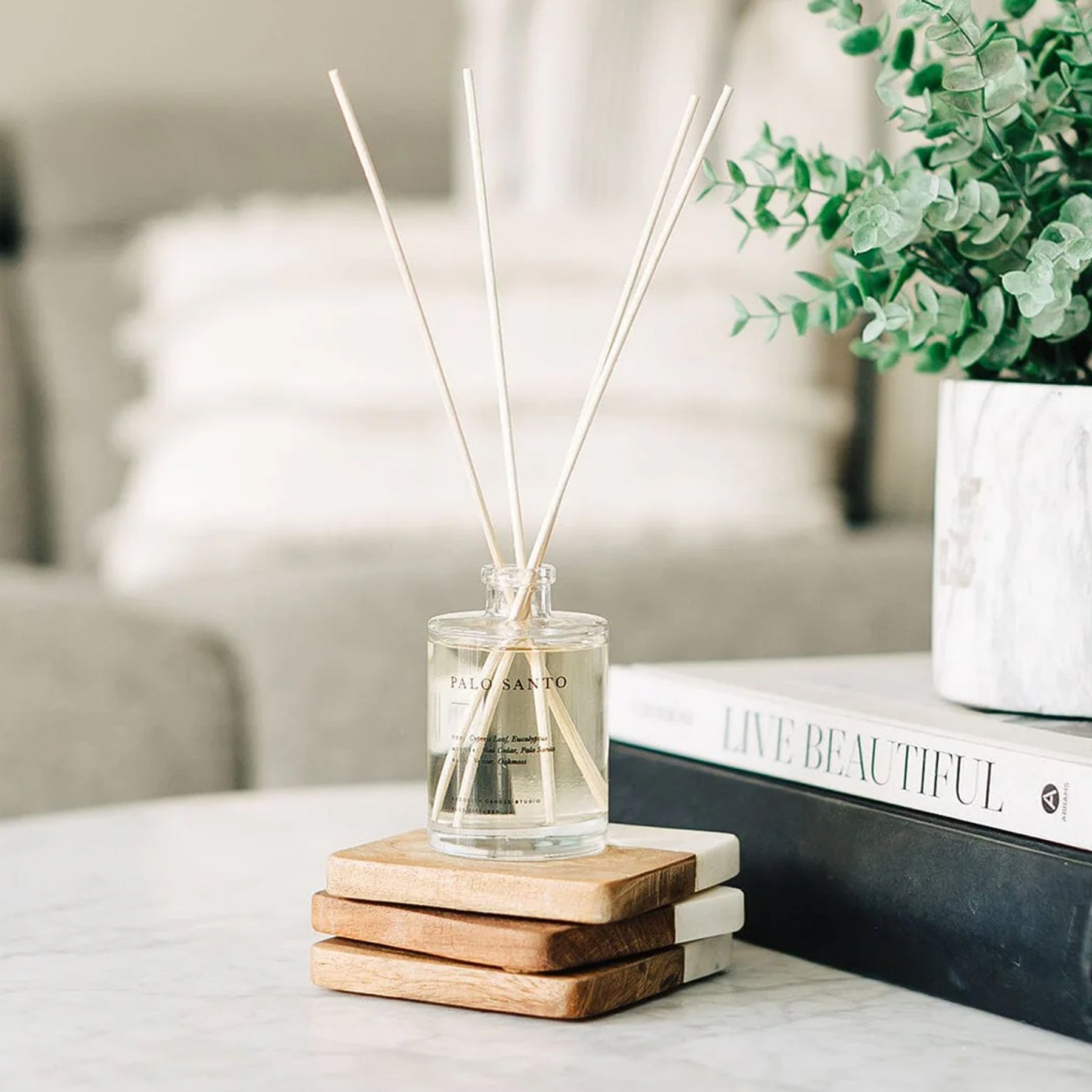 Reed Diffusers are the perfect flame-free option for your bathroom, home office, or entry way. Our custom made glass screenprinted Reed Diffuser bottles are packed in a two-piece textured paper tube. Includes wooden stopper and 8 rattan reeds.
